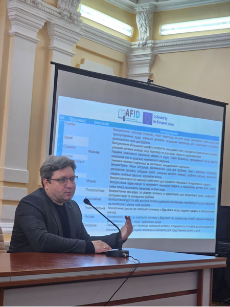 On March 7, 2024, students and academic staff of Polissia National University met with Dr. Sc. (Economics), Prof. Oleksandr Dluhopolskyi, Executive Director of the NGO “Civic Synergy”. In his speech, Oleksandr Dluhopolskyi highlighted the specifics of implementing inclusivity in university online courses, drawing on the experience of the ERASMUS+ CBHE project “AFID – Academic Freedom and Inclusion through Digitalization”.